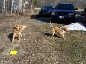 We picked up Dixie on Saturday, April 19. She is a sweet young golden. She is completely housebroken. She is beginning to play with our two young goldens. She will go in the crate, but she doesn't really need to be crated. She has not stolen any socks or torn up any furniture. She does know some simple commands and she learned to use the doggy door in about a day or so. More, when we get to know her.